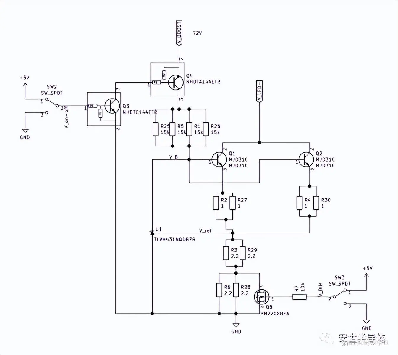 在升压转换器的输出级使用线性调节,可将 24 V 电源电压转换为 72 V,为两个并联的 LED 灯串提供所需的高电压。两个并联的 100 V NPN 晶体管的基极端子使用可调精度并联稳压器控制,使其在线性区域内工作。反馈回路中的电阻决定负载电流的大小,因此最亮工作模式下的总电流消耗为 1 A。