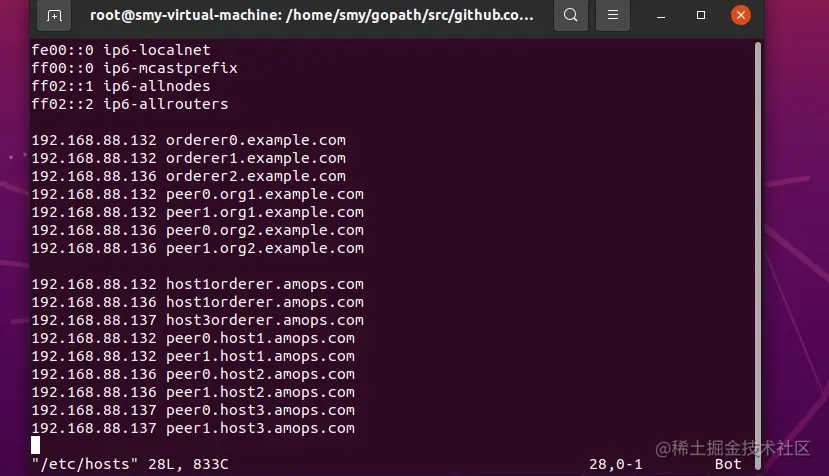 192.168.xxx.xxx host1orderer.amops.com 192.168.xxx.xxx host2orderer.amops.com 192.168.xxx.xxx host3orderer.amops.com 192.168.xxx.xxx peer0.host1.amops.com 192.168.xxx.xxx peer1.host1.amops.com 192.168.xxx.xxx peer0.host2.amops.com 192.168.xxx.xxx peer1.host2.amops.com 192.168.xxx.xxx peer0.host3.amops.com 192.168.xxx.xxx peer1.host3.amops.com