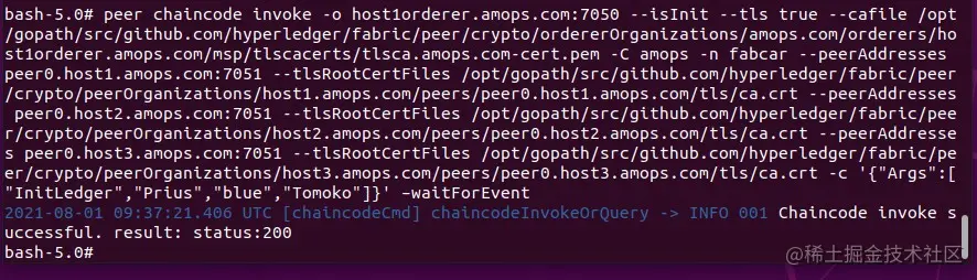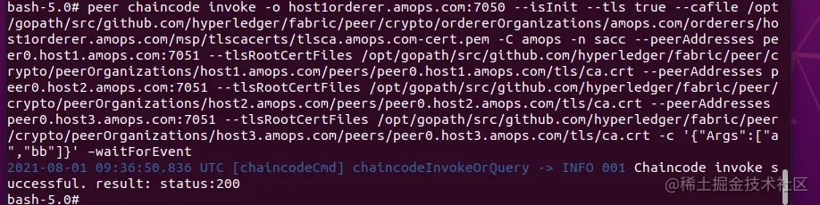 peer chaincode invoke -o host1orderer.amops.com:7050 --isInit --tls true --cafile /opt/gopath/src/github.com/hyperledger/fabric/peer/crypto/ordererOrganizations/amops.com/orderers/host1orderer.amops.com/msp/tlscacerts/tlsca.amops.com-cert.pem -C amops -n sacc --peerAddresses peer0.host1.amops.com:7051 --tlsRootCertFiles /opt/gopath/src/github.com/hyperledger/fabric/peer/crypto/peerOrganizations/host1.amops.com/peers/peer0.host1.amops.com/tls/ca.crt --peerAddresses peer0.host2.amops.com:7051 --tlsRootCertFiles /opt/gopath/src/github.com/hyperledger/fabric/peer/crypto/peerOrganizations/host2.amops.com/peers/peer0.host2.amops.com/tls/ca.crt --peerAddresses peer0.host3.amops.com:7051 --tlsRootCertFiles /opt/gopath/src/github.com/hyperledger/fabric/peer/crypto/peerOrganizations/host3.amops.com/peers/peer0.host3.amops.com/tls/ca.crt -c '{"Args":["a","bb"]}' –waitForEvent