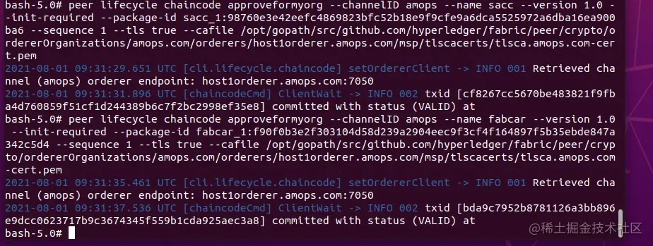 peer lifecycle chaincode approveformyorg --channelID amops --name sacc --version 1.0 --init-required --package-id sacc_1:98760e3e42eefc4869823bfc52b18e9f9cfe9a6dca5525972a6dba16ea900ba6 --sequence 1 --tls true --cafile /opt/gopath/src/github.com/hyperledger/fabric/peer/crypto/ordererOrganizations/amops.com/orderers/host1orderer.amops.com/msp/tlscacerts/tlsca.amops.com-cert.pem