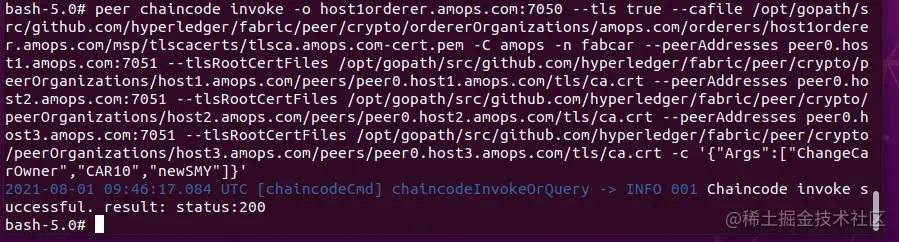 peer chaincode invoke -o host1orderer.amops.com:7050 --tls true --cafile /opt/gopath/src/github.com/hyperledger/fabric/peer/crypto/ordererOrganizations/amops.com/orderers/host1orderer.amops.com/msp/tlscacerts/tlsca.amops.com-cert.pem -C amops -n fabcar --peerAddresses peer0.host1.amops.com:7051 --tlsRootCertFiles /opt/gopath/src/github.com/hyperledger/fabric/peer/crypto/peerOrganizations/host1.amops.com/peers/peer0.host1.amops.com/tls/ca.crt --peerAddresses peer0.host2.amops.com:7051 --tlsRootCertFiles /opt/gopath/src/github.com/hyperledger/fabric/peer/crypto/peerOrganizations/host2.amops.com/peers/peer0.host2.amops.com/tls/ca.crt --peerAddresses peer0.host3.amops.com:7051 --tlsRootCertFiles /opt/gopath/src/github.com/hyperledger/fabric/peer/crypto/peerOrganizations/host3.amops.com/peers/peer0.host3.amops.com/tls/ca.crt -c '{"Args":["ChangeCarOwner","CAR10","newSMY"]}'