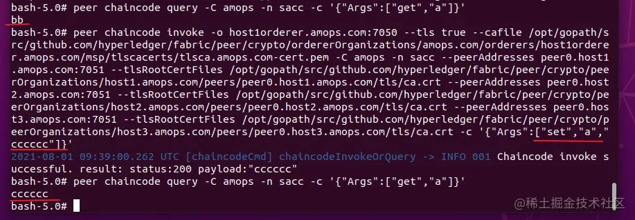 peer chaincode invoke -o host1orderer.amops.com:7050 --tls true --cafile /opt/gopath/src/github.com/hyperledger/fabric/peer/crypto/ordererOrganizations/amops.com/orderers/host1orderer.amops.com/msp/tlscacerts/tlsca.amops.com-cert.pem -C amops -n sacc --peerAddresses peer0.host1.amops.com:7051 --tlsRootCertFiles /opt/gopath/src/github.com/hyperledger/fabric/peer/crypto/peerOrganizations/host1.amops.com/peers/peer0.host1.amops.com/tls/ca.crt --peerAddresses peer0.host2.amops.com:7051 --tlsRootCertFiles /opt/gopath/src/github.com/hyperledger/fabric/peer/crypto/peerOrganizations/host2.amops.com/peers/peer0.host2.amops.com/tls/ca.crt --peerAddresses peer0.host3.amops.com:7051 --tlsRootCertFiles /opt/gopath/src/github.com/hyperledger/fabric/peer/crypto/peerOrganizations/host3.amops.com/peers/peer0.host3.amops.com/tls/ca.crt -c '{"Args":["set","c","bbbb"]}'
