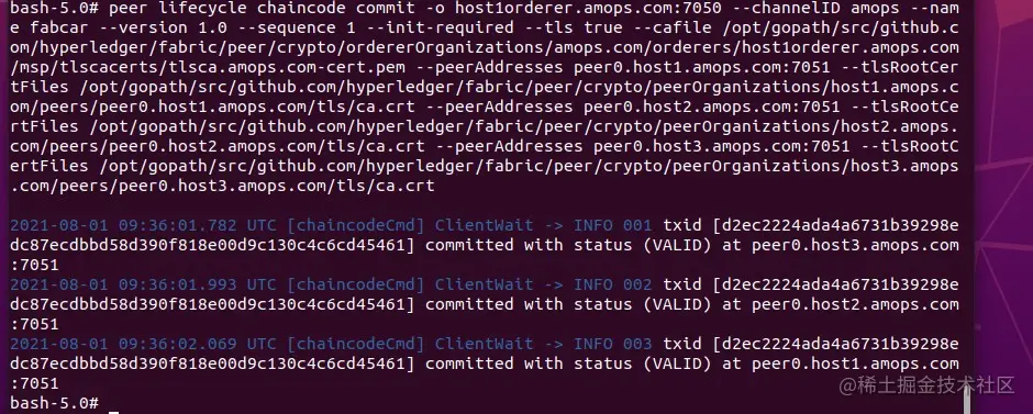 peer lifecycle chaincode commit -o host1orderer.amops.com:7050 --channelID amops --name fabcar --version 1.0 --sequence 1 --init-required --tls true --cafile /opt/gopath/src/github.com/hyperledger/fabric/peer/crypto/ordererOrganizations/amops.com/orderers/host1orderer.amops.com/msp/tlscacerts/tlsca.amops.com-cert.pem --peerAddresses peer0.host1.amops.com:7051 --tlsRootCertFiles /opt/gopath/src/github.com/hyperledger/fabric/peer/crypto/peerOrganizations/host1.amops.com/peers/peer0.host1.amops.com/tls/ca.crt --peerAddresses peer0.host2.amops.com:7051 --tlsRootCertFiles /opt/gopath/src/github.com/hyperledger/fabric/peer/crypto/peerOrganizations/host2.amops.com/peers/peer0.host2.amops.com/tls/ca.crt --peerAddresses peer0.host3.amops.com:7051 --tlsRootCertFiles /opt/gopath/src/github.com/hyperledger/fabric/peer/crypto/peerOrganizations/host3.amops.com/peers/peer0.host3.amops.com/tls/ca.crt