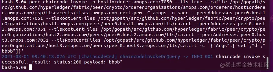 peer chaincode invoke -o host1orderer.amops.com:7050 --tls true --cafile /opt/gopath/src/github.com/hyperledger/fabric/peer/crypto/ordererOrganizations/amops.com/orderers/host1orderer.amops.com/msp/tlscacerts/tlsca.amops.com-cert.pem -C amops -n sacc --peerAddresses peer0.host1.amops.com:7051 --tlsRootCertFiles /opt/gopath/src/github.com/hyperledger/fabric/peer/crypto/peerOrganizations/host1.amops.com/peers/peer0.host1.amops.com/tls/ca.crt --peerAddresses peer0.host2.amops.com:7051 --tlsRootCertFiles /opt/gopath/src/github.com/hyperledger/fabric/peer/crypto/peerOrganizations/host2.amops.com/peers/peer0.host2.amops.com/tls/ca.crt --peerAddresses peer0.host3.amops.com:7051 --tlsRootCertFiles /opt/gopath/src/github.com/hyperledger/fabric/peer/crypto/peerOrganizations/host3.amops.com/peers/peer0.host3.amops.com/tls/ca.crt -c '{"Args":["set","d","bbbb"]}'