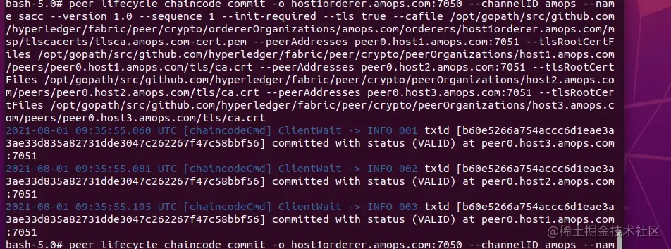peer lifecycle chaincode commit -o host1orderer.amops.com:7050 --channelID amops --name sacc --version 1.0 --sequence 1 --init-required --tls true --cafile /opt/gopath/src/github.com/hyperledger/fabric/peer/crypto/ordererOrganizations/amops.com/orderers/host1orderer.amops.com/msp/tlscacerts/tlsca.amops.com-cert.pem --peerAddresses peer0.host1.amops.com:7051 --tlsRootCertFiles /opt/gopath/src/github.com/hyperledger/fabric/peer/crypto/peerOrganizations/host1.amops.com/peers/peer0.host1.amops.com/tls/ca.crt --peerAddresses peer0.host2.amops.com:7051 --tlsRootCertFiles /opt/gopath/src/github.com/hyperledger/fabric/peer/crypto/peerOrganizations/host2.amops.com/peers/peer0.host2.amops.com/tls/ca.crt --peerAddresses peer0.host3.amops.com:7051 --tlsRootCertFiles /opt/gopath/src/github.com/hyperledger/fabric/peer/crypto/peerOrganizations/host3.amops.com/peers/peer0.host3.amops.com/tls/ca.crt