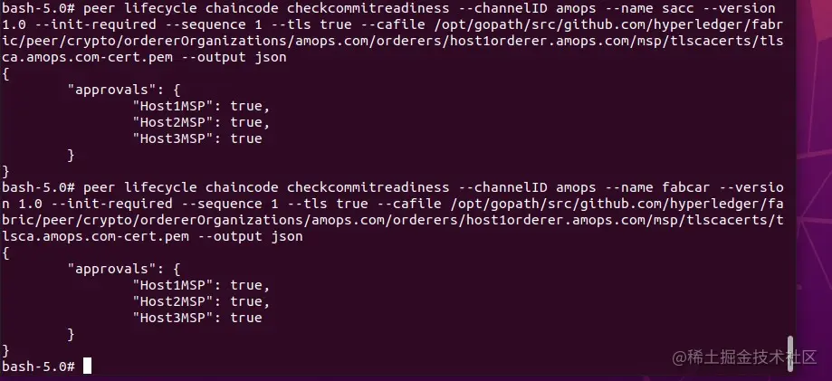 peer lifecycle chaincode checkcommitreadiness --channelID amops --name fabcar --version 1.0 --init-required --sequence 1 --tls true --cafile /opt/gopath/src/github.com/hyperledger/fabric/peer/crypto/ordererOrganizations/amops.com/orderers/host1orderer.amops.com/msp/tlscacerts/tlsca.amops.com-cert.pem --output json