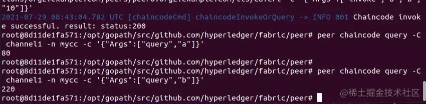 peer chaincode query -C channel1 -n mycc -c '{"Args":["query","b"]}'