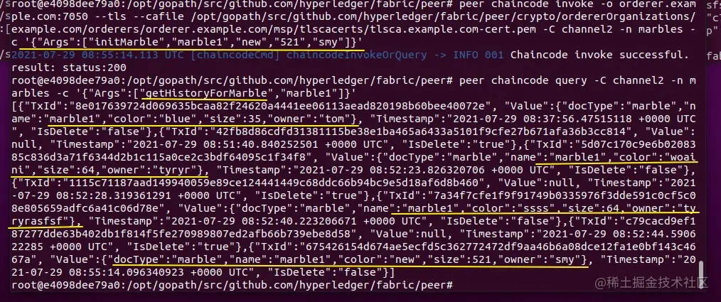 peer chaincode query -C channel2 -n marbles -c '{"Args":["getHistoryForMarble","marble1"]}'