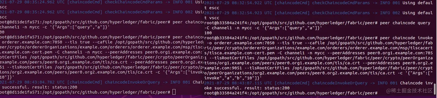 peer chaincode invoke -o orderer.example.com:7050 --tls true --cafile /opt/gopath/src/github.com/hyperledger/fabric/peer/crypto/ordererOrganizations/example.com/orderers/orderer.example.com/msp/tlscacerts/tlsca.example.com-cert.pem -C channel1 -n mycc --peerAddresses peer0.org1.example.com:7051 --tlsRootCertFiles /opt/gopath/src/github.com/hyperledger/fabric/peer/crypto/peerOrganizations/org1.example.com/peers/peer0.org1.example.com/tls/ca.crt --peerAddresses peer0.org2.example.com:9051 --tlsRootCertFiles /opt/gopath/src/github.com/hyperledger/fabric/peer/crypto/peerOrganizations/org2.example.com/peers/peer0.org2.example.com/tls/ca.crt -c '{"Args":["invoke","a","b","10"]}'