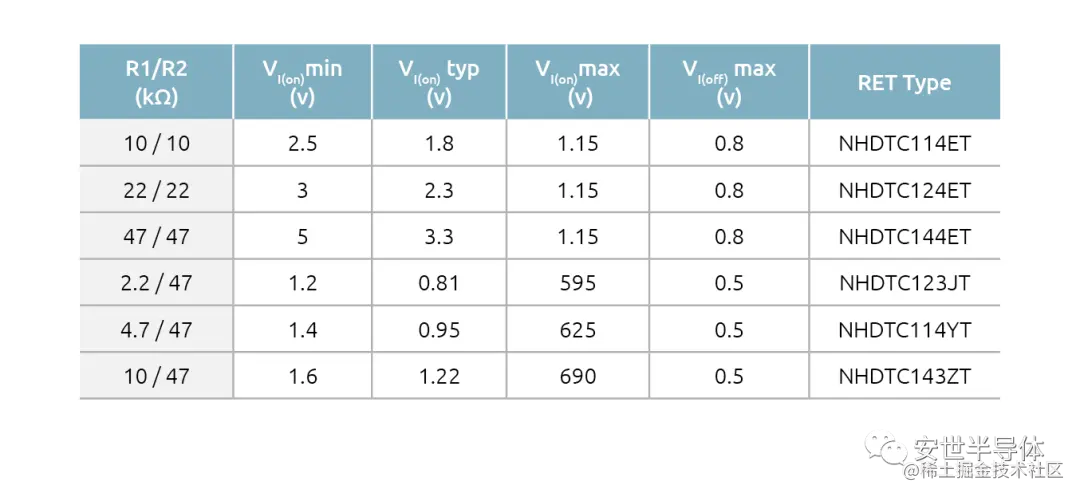 表 1 显示了导通和关断状态的输入电压对 Nexperia NHDTC 系列 RET 中的电阻分压器配置的依赖性。在 VI(off)条件下,会有一个微小的基极电流流过晶体管(约0.3 µA)。关闭 RET 所需的电压典型值与电阻比 R1/R2 有关。当晶体管关闭时,可以通过 R2 或基极-发射极二极管两端的压降目标来计算此值。对于 NHDTC 系列,该电压大约为 580 mV。因此,电阻比为 1 时的 VI(off) 值具有相同的电压(表1中的第1-3行)。由于上述原因,当 R2 为 47 kΩ,且 R1 值为 2.2 kΩ、4.7 kΩ 或 10 kΩ时,关断状态的典型电压值均会较低。VI(off) max 需为偶数值,以确保器件在图 2 中最左侧的深绿色阴影区域内运行。