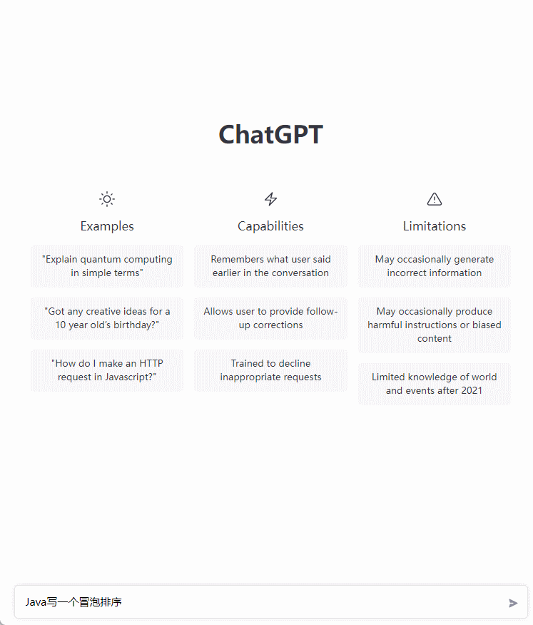 比如,你想写个冒泡排序,就直接告诉他:用Java写一个冒泡排序,立刻就能得到一个详细的思路以及代码实现;