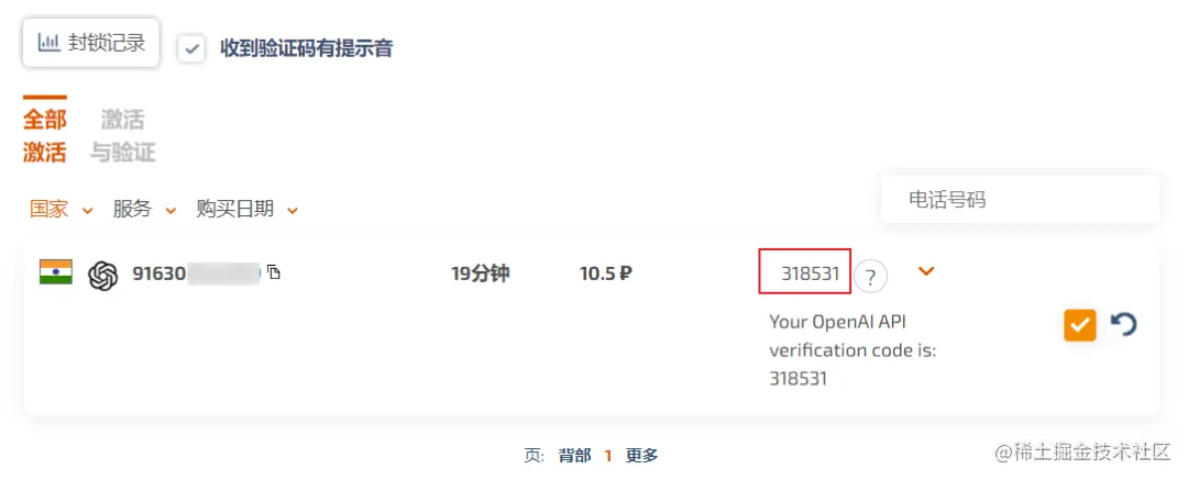 - 第三步,选择接码号码在左侧的输入框输入:openai,筛选最便宜的印度,然后选择买入就能得到一个可用的印度号码,并复制出来