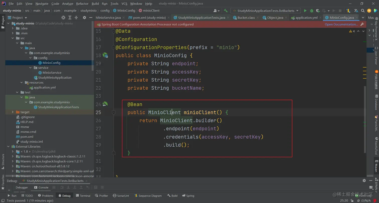 如图所示,新增MinioConfig配置类,Builder一个MinioClient对象交给spring管理。