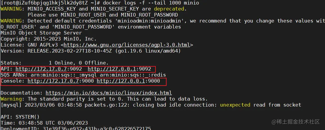获取方式,因为我部署的是docker,启动命令上指定了控制台端口号,以及api端口号,我这边就执行一下docker logs -f --tail 1000 minio查看容器日志的命令。如下图所示,就是我们API地址。
