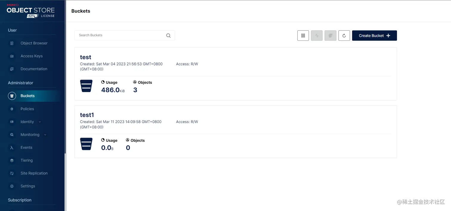 我们去到我们的minio控制台查看是否创建了test1的bucket。