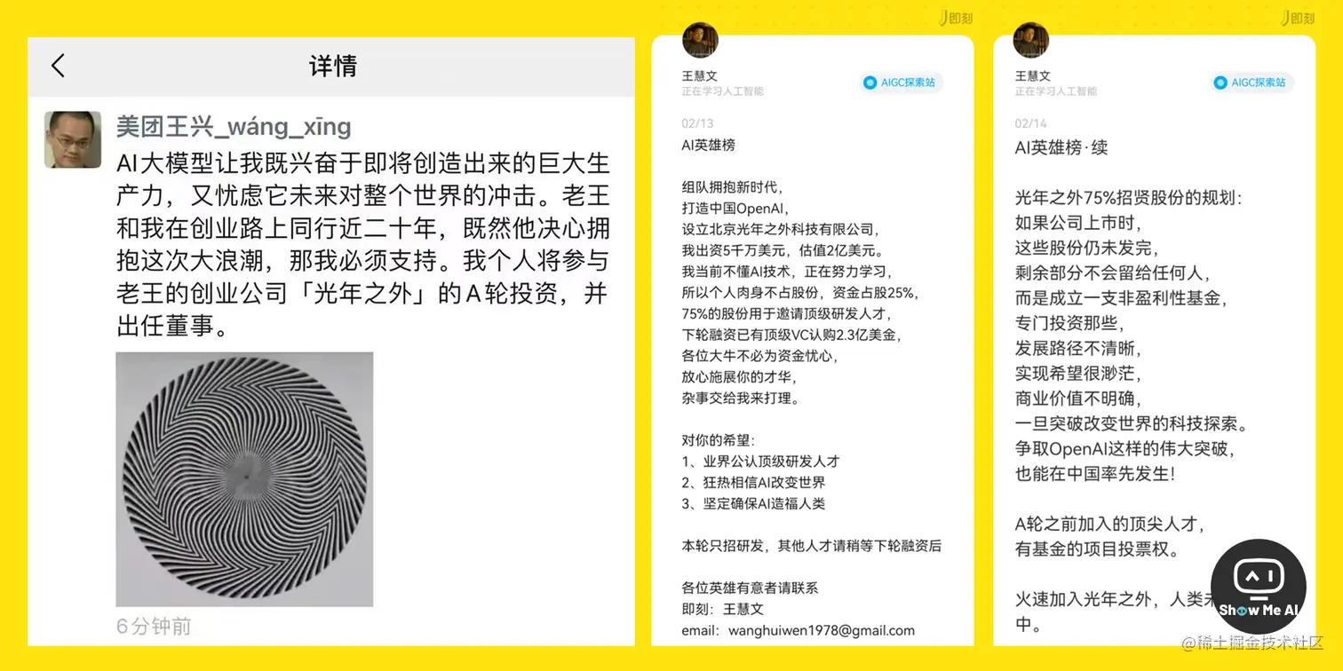 此前 2 月 13 日,原美团联合创始人王慧文发布招聘信息,称设立北京光年之外科技有限公司,用于打造中国 OpenAI。王慧文表示,计划个人出资 5000 万美元,估值 2 亿美元。个人肉身不占股份,资金占股 25%,75% 的股份用于邀请顶级研发人才。