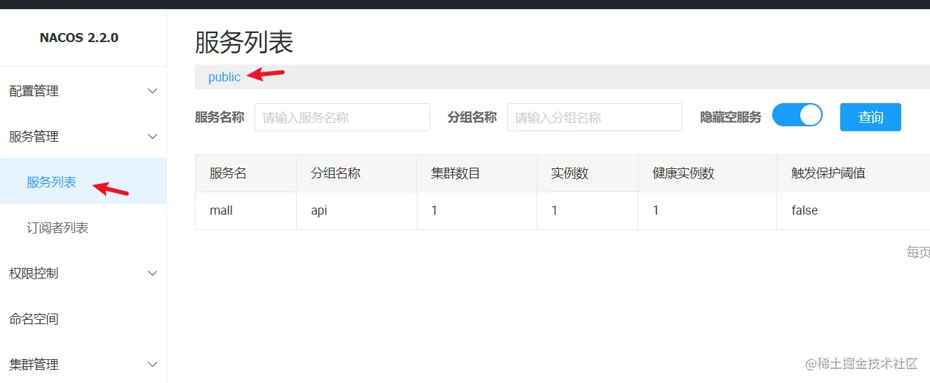 初始账号密码均是 nacos,登录成功后 即可看到 服务列表