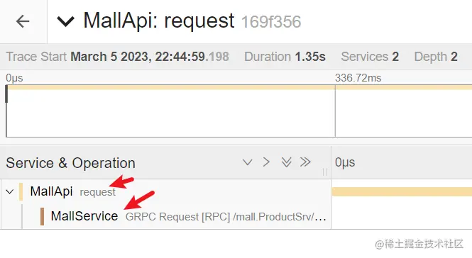 选择 MallApi 点击 find traces 。看到我们刚才的请求,再点击详情,如下
