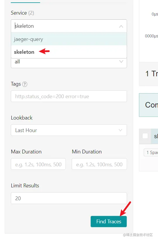 我们打开浏览器 访问 http://127.0.0.1:5000/ (若有调整环境变量 jaeger 端口自行修改)即可看到刚才访问 我们的 product 服务 留下的痕迹。由于我们的项目名称 没改动 所以显示的是 默认的 skeleton