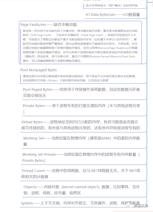 每当有一页内存不在当前内存工作集中时,就会触发缺页中断。重点是本数值既包含内存软缺页(Soft Page Fault),又包含内存硬缺页(Hard Page Fault)。软缺页对性能没什么大碍,可能是为了调取已加载但不属于当前进程的内存页(比如属于共享DLL的内存页)。硬缺页对性能的影响则要严重得多,因为这意味着数据位于磁盘而非内存中。不幸的是,你无法通过性能计数器跟踪每个进程的硬缺页情况,但可以利用Memory\Page Reads/sec计数器观察到整个系统的硬缺页情况。你可以将某个进程的缺页中断总数和系统的内存读取总页数(硬缺页)结合起来,进行关联分析。通过ETW跟踪Windows Kernel/Memory/Hard Fault事件,可以准确地跟踪某个进程的硬缺页情况。