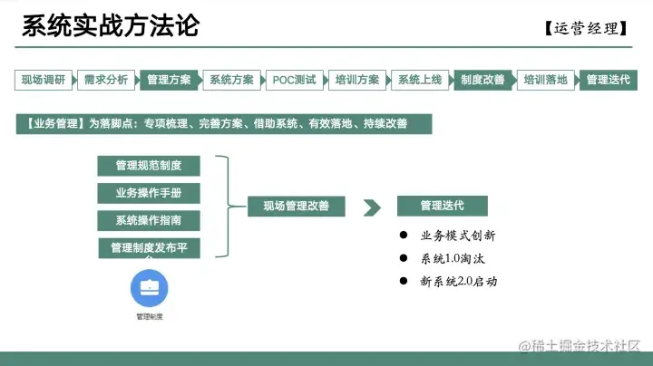 管理方案的汇报一定是项目落地过程中最重要的一个环节,且要有相关的甲方、业务专家在。这里有个管理闭环:现场运营——运营数据——系统报告——管理决策,一定要和老板去以及业务专家确认方案。