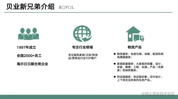我先简单介绍一下贝业新兄弟,我们是一家拥有2000人的物流公司,1997年成立于广州,现总部在上海,是海尔日日顺下面的合资企业,专注于家居卫浴、营养品、快消品行业中供应链物流服务。