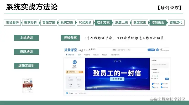 我们把培训分成三类,即:上线培训、循环培训、继任者培训。上线时我们需要给甲方做操作培训,上线之后需要支持客户去做循环培训应对人员岗位变动。如果有新员工入职,他需要采取一定的方式学习,让系统持续运行下去,因此要有继任者培训。