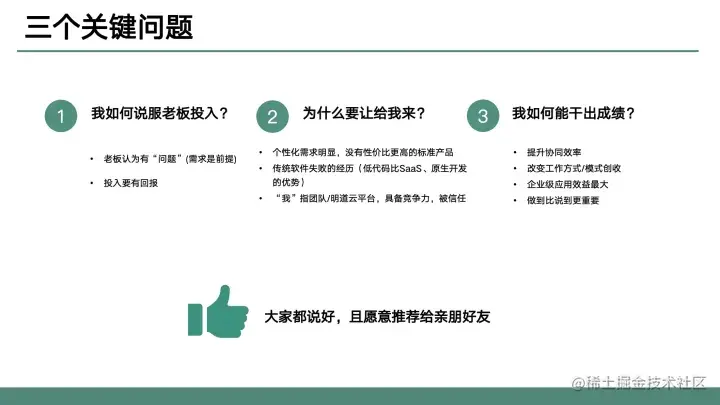 这里的“我”代表的是明道云,是我们伙伴,是甲方负责人。这三方如何去取得老板的信任,让老板同意用明道云的产品呢?我有三个体验: