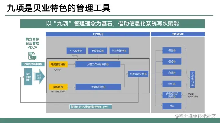 我们公司老板总结出了“九项”管理,这在企业管理里面是非常重要的一个管理方法,也得到了我们公司员工的普遍认同。大家随便找本管理类的书来看,可能发现“九项”中的内容里面都讲过,但是如何将这些内容融会贯通,形成企业日常工作中所需要的一些方法手段,这个是更加重要的。我们公司做到了把书上的理论真正变成了员工日常在执行的一些内容。举个例子:我们有IDP个人改善点,要求领导跟他的员工要做定期的回顾,看这个员工有哪些地方要去学习和改善的。