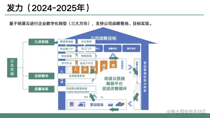 我们计划从三个方向去做,第一个就是刚才说的“九项”,我们会把相关的内容,从管理角度用平台工具去搭出来。第二是业财融合,即全面预算管理,这个事情目前只是一个构想。第三是质量体系,我们会做一个区域运营管理体系,支撑整个公司的战略目标。