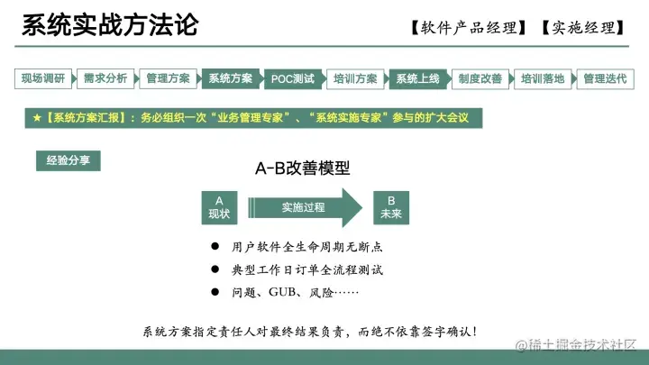 从传统软件行业中产品经理和实施经理的角度出发,需要做系统方案汇报。现场调研完之后,形成一份现场管理的方案,紧接着设计系统,这个阶段,我们需要让业务专家与实施专家一起开一个扩大会议,确保系统方案的可行性。