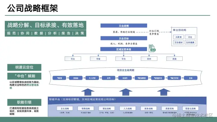 **最后是中台赋能。**它不像IT行业中理解的中台,而是从业务的角度出发,我需要去搭建一套能支撑公司200个项目正常运转的系统。