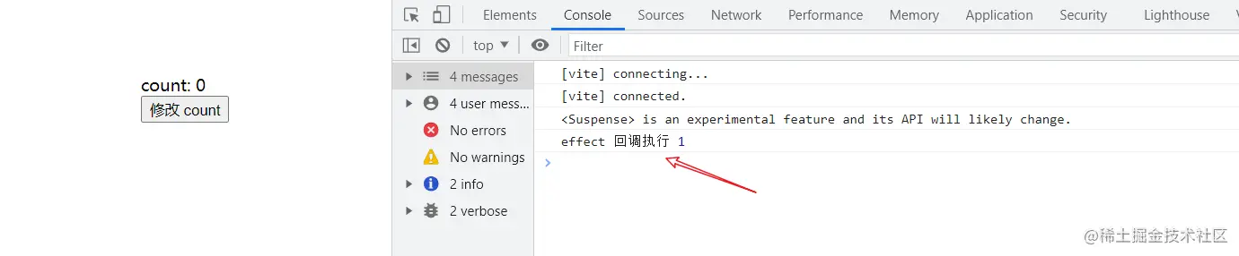 当我修改count 的值时:点击一次按钮,副作用函数就会执行一次,这是因为 count 这个依赖项发生了改变,effect 的副作用函数就会执行