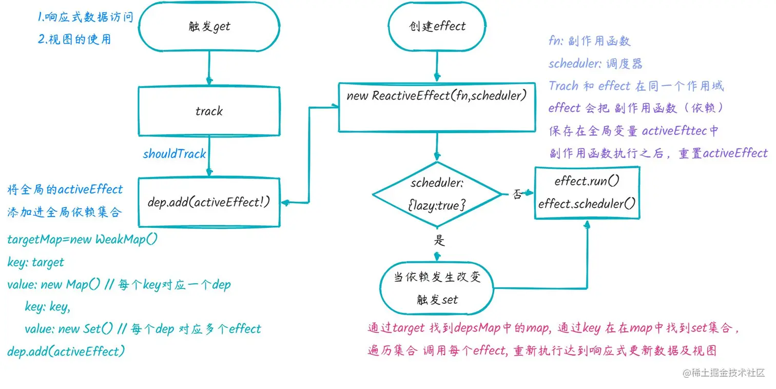 - 响应式数据被读取时,触发get => track => effect 会被添加到该数据的依赖列表中