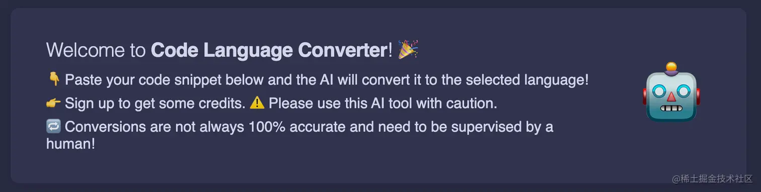 该网站的功能很神奇,可以实现编程语言的转化。感觉在一些场景之下还是有点作用的,比如你原来跟我一样是做Java的,因为工作需要突然转Go。这个时候用你Java的经验 + 这个工具,或许可以起到一定的帮助作用。
