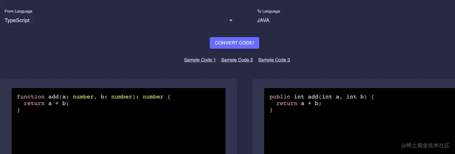 工具的使用也很简单,只需要在左侧黏贴你想转换的原始代码,然后点击CONVERT CODE,右侧输入框就会转换成目标代码: