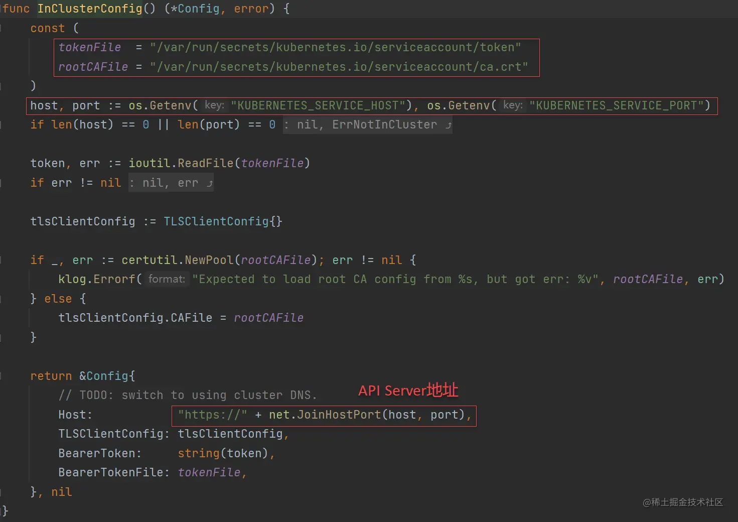 一般Prometheus部署在监控云原生集群上,从 Pod 使用 Kubernetes API 官方客户端库(client-go)提供了更为简便的方法:rest.InClusterConfig()。 API Server地址是从POD的环境变量KUBERNETES_SERVICE_HOST和KUBERNETES_SERVICE_PORT构建出来, token 以及 ca 信息从POD固定的文件中获取,因此这种场景下kubernetes_sd_configs中api_server和ca_file是不需要配置的。