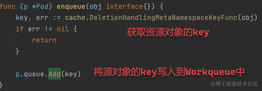 4、事件处理,AddFunc、DeleteFunc和UpdateFunc注册的事件处理逻辑一样,处理逻辑也比较简单:就是获取资源对象key,并将其写入到Workqueue中;