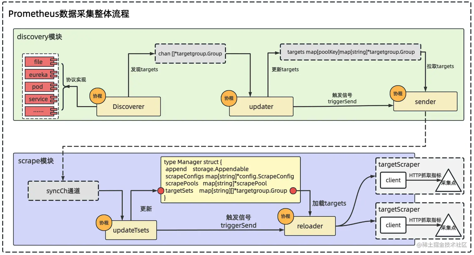 上节分析了Prometheus服务发现核心流程(如下图),Discoverer基于不同协议发现采集点,通过channel通知到updater协程,然后更新到discoveryManager结构体trargets字段中,最终由sender协程将discoveryManager的targets字段数据发送给scrape采集模块。