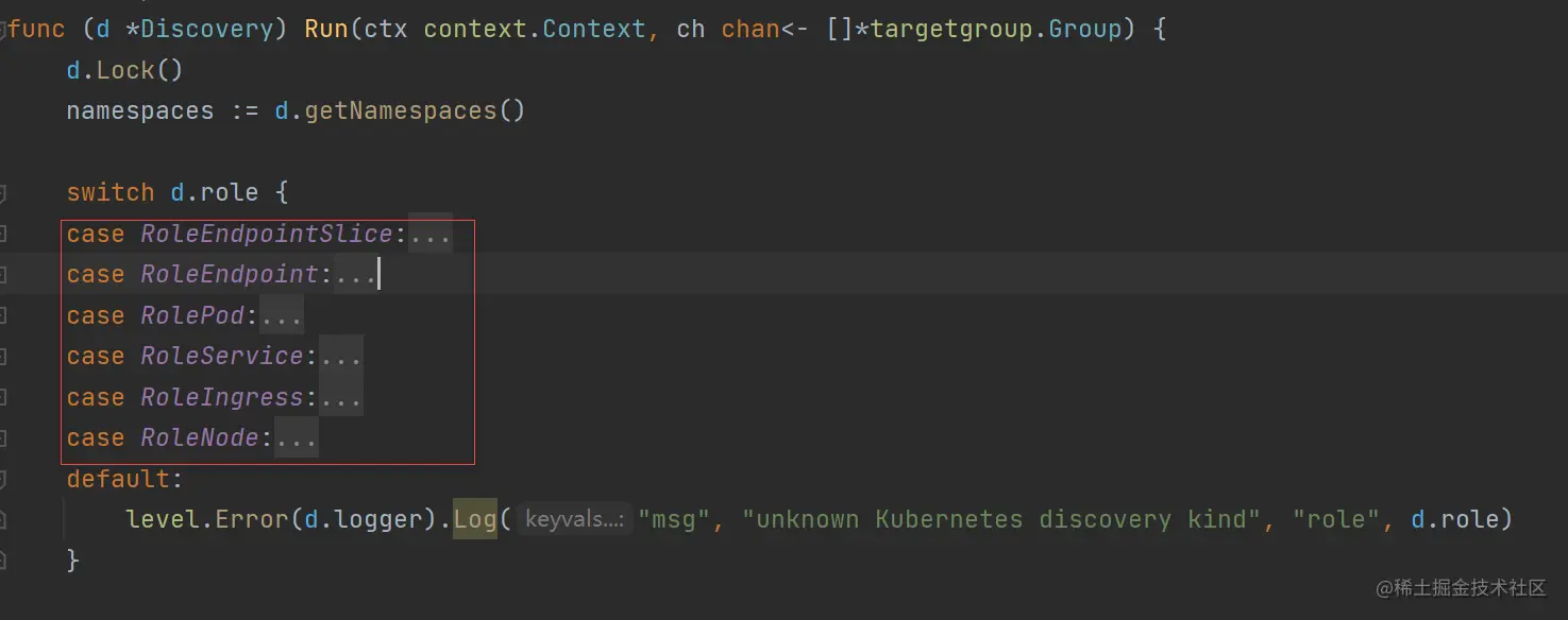 Run方法中switch罗列出不同role的处理逻辑,刚好和配置示例中role支持的六种云原生对象类型对应,只是基于不同的对象进行服务发现,基本原理都是一致的。