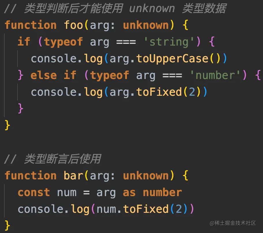 any,与any类型不同的是,unknown类型的变量不能直接赋值给其他类型的变量,也不能调用其上的任何方法或属性,除非先进行类型检查或类型断言,这样确保运行时的类型安全 - 默认在其操作都是不合法的,主要是在编写通用代码时,例如编写库或框架时,需要处理来自不同来源的数据,但又不确定数据的类型