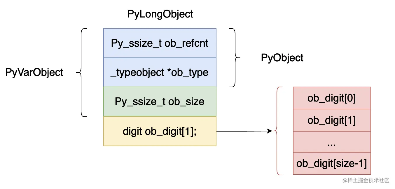 - ob_size,这个字段表示这个整型对象数组 ob_digit 当中一共有多少个元素。