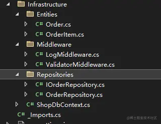 Infrastructure中就是项目的基础设施了,看图我们发现Entity和Middleware,Repository,DbContext都在基础设施中
