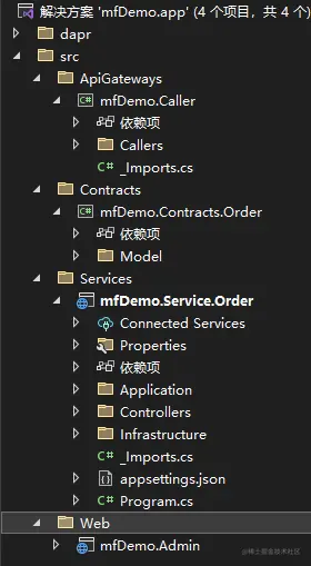 项目区分src/ApiGateways,src/Contracts,src/Services,src/Web四层,这个时候可能就会有很多人有疑惑了,为什么跟传统的Abp架构设计有些差异,其实这个就是MasaFramework的框架美妙之处。