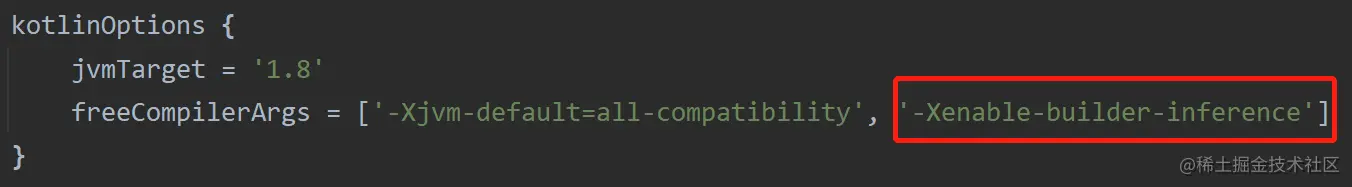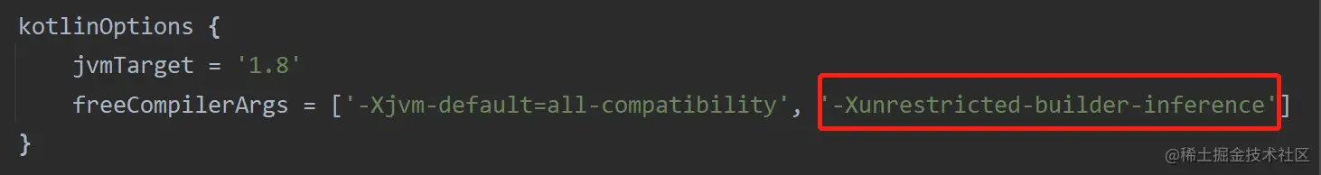 只需要增加一个compile option:-Xunrestricted-builder-inference, 或者在kotlinOption中增加一个配置字段: -language-version 1.6,都能解除上面的限制,这里我们使用第一种: