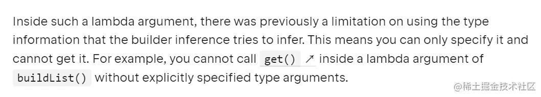 可以看到buildList{}使用时不用显示指定方法泛型类型就完成了自动推断,靠的就是@BuilderInference注解,接下来我们具体的讲一讲。
