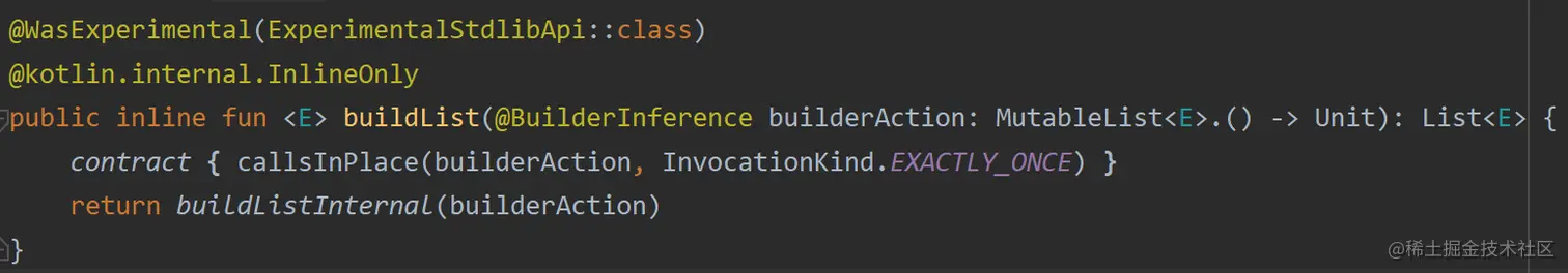 这个注解大家可能有些陌生,但在日常开发中肯定使用过用其实现的扩展函数,比如buildList{}构建集合: