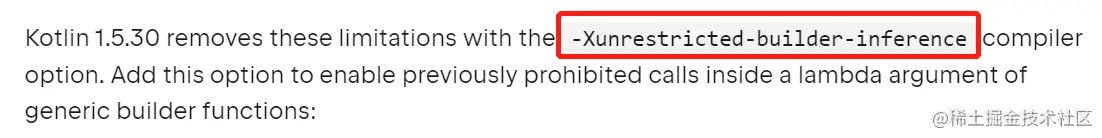 -Xunrestricted-builder-inference对应增强的功能,无需显示声明这个compiler option,并且通过声明-Xenable-builder-inference这个compiler option,不用再显示声明@BuilderInference注解了;