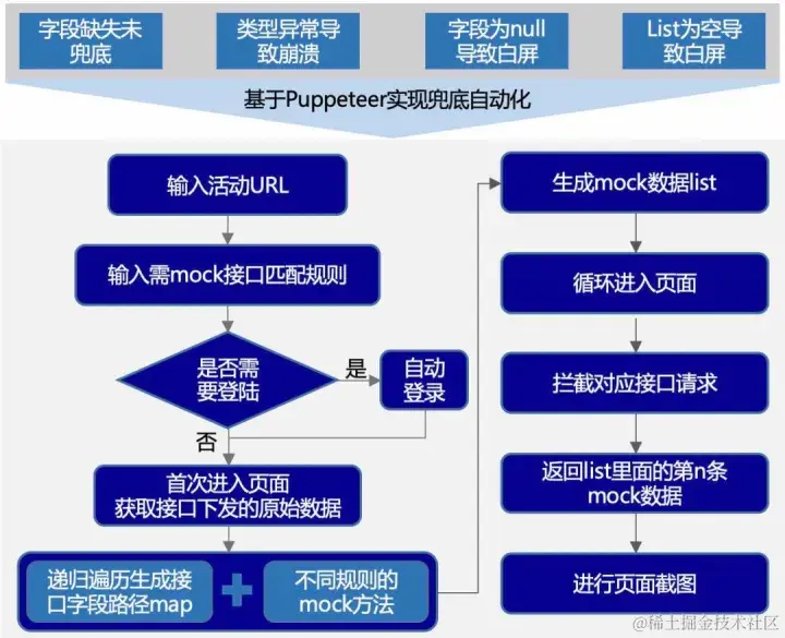 针对常出现的兜底类问题,如接口下发字段缺失、字段类型异常、字段为null、list为空等场景,需要测试针对核心字段逐个进行mock测试,费时费力且有可能遗漏字段。为提高兜底测试效率,我们开发了一套兜底自动化工具,只需输入被测活动链接和待mock接口匹配规则,系统便会针对所有字段自动生成mock文件,并循环mock各个场景,最终输出mock结果截图,测试只需要对结果截图进行check。提效效果明显,接口字段覆盖率提升到100%,大大减少漏测情况。