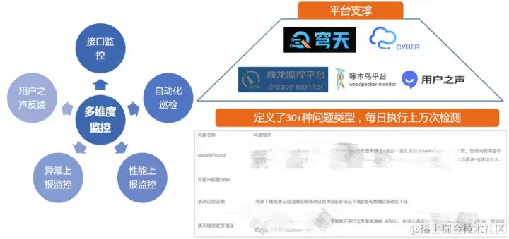 线上巡检:通过接口监控、自动化扫描、性能上报监控、异常上报监控、用户反馈值班5大手段实现多维度监控。